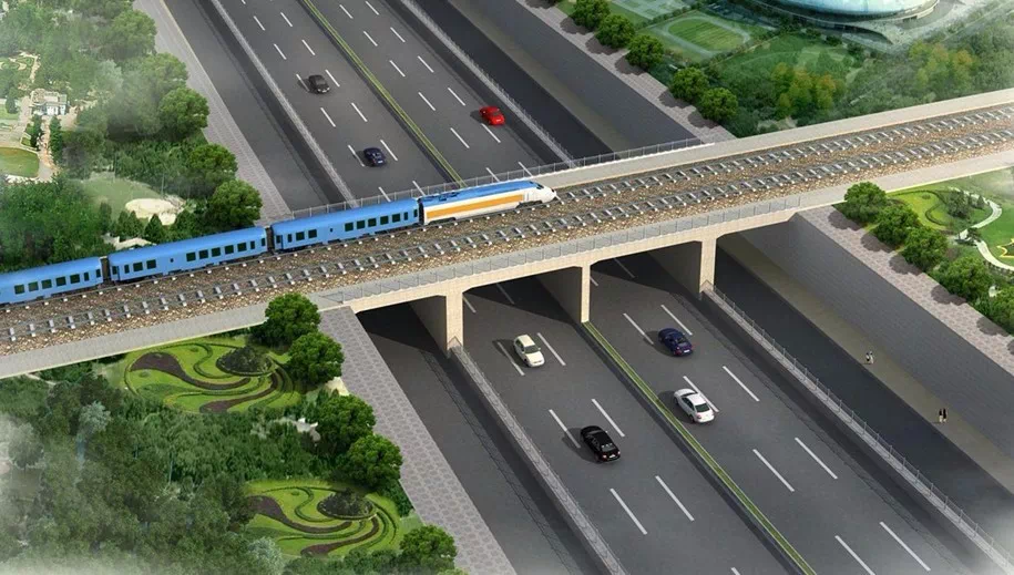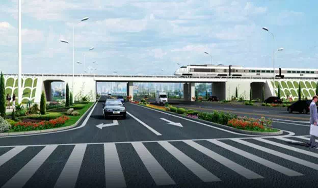 五针街铁路立交桥工程位于五针街与西二环连接处,道路下穿太焦铁路,铁路立交桥主体及引道工程长约440米,宽50米,为3孔布设。