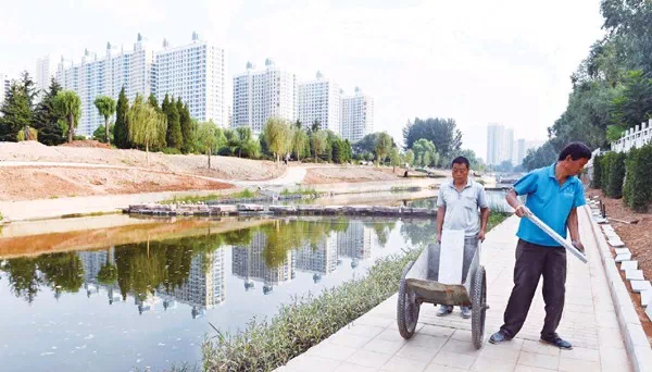 在石子河下游潞泽桥西至污水处理厂施工段宽20米的河道里,挖掘机、夯土机不停作业,运土车川流不息,工人们正在进行河道扩挖疏浚和河道防渗处理。此施工段上游、潞泽桥东的石子河,在经过河道治理、控源截污和滨水空间(水土)保持后,已经初步实现水体改善、岸绿景美。